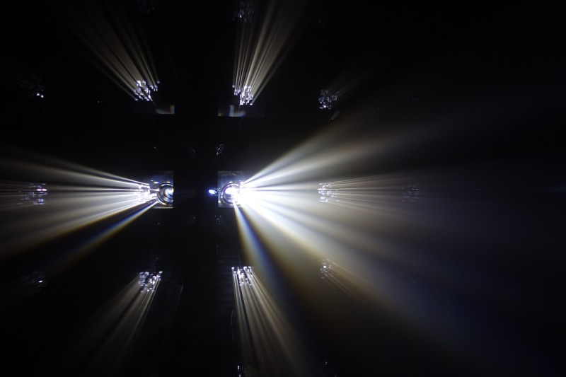 Transduktor is an audio/visual installation consisting of an long Plexiglas box hanging suspended from the ceiling. The box is filled with fog while a projector, mounted inside, projects continuously changing generative patterns and sequences. With the fog acting as a scatterer, the light is seemingly captured as a three dimensional sculptural object and attention is drawn away from the generating imagery towards its intricate physical manifestation. The accompanying sounds enforce the tension between the dense atmosphere inside the box and the surrounding open space.