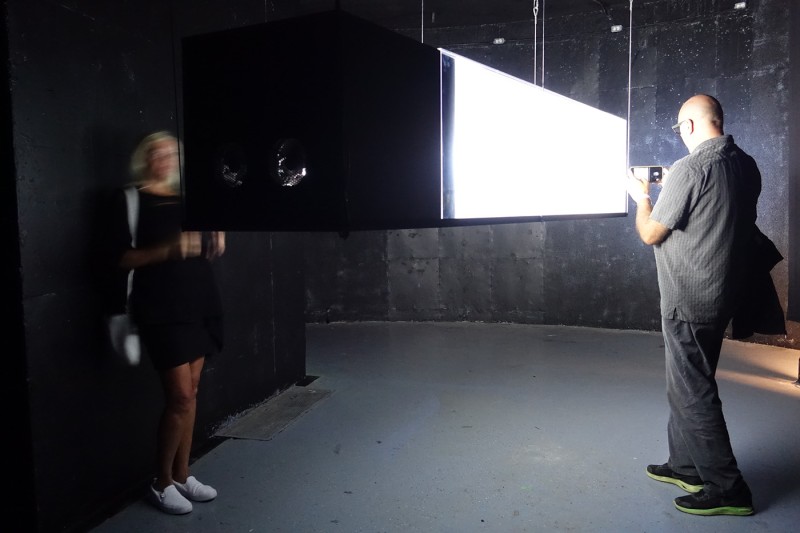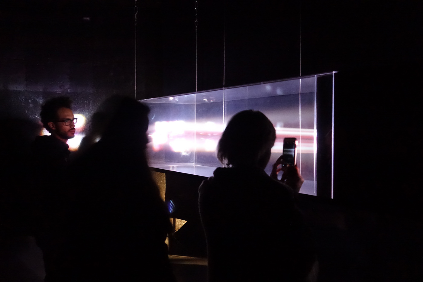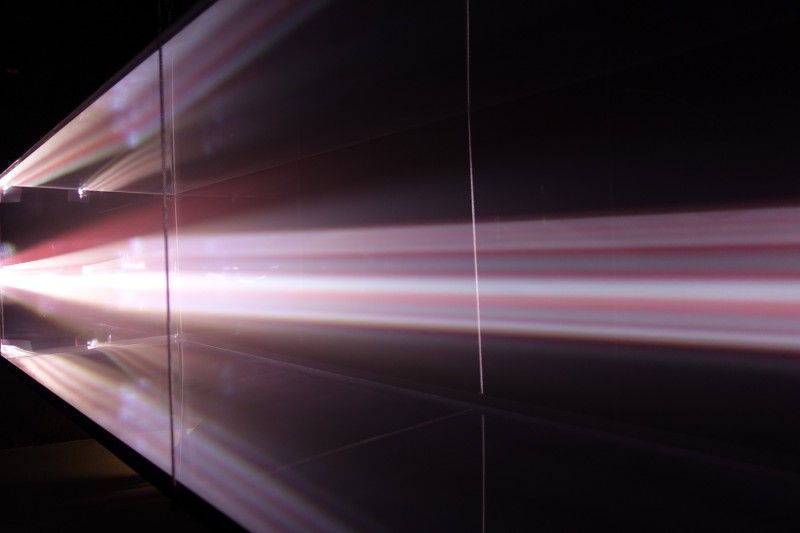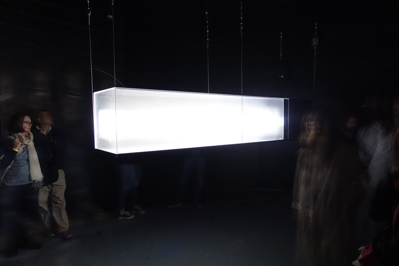 Transduktor is an audio/visual installation consisting of an long Plexiglas box hanging suspended from the ceiling. The box is filled with fog while a projector, mounted inside, projects continuously changing generative patterns and sequences. With the fog acting as a scatterer, the light is seemingly captured as a three dimensional sculptural object and attention is drawn away from the generating imagery towards its intricate physical manifestation. The accompanying sounds enforce the tension between the dense atmosphere inside the box and the surrounding open space.